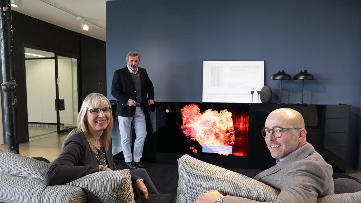 Fernseher und Sideboard sind eins: Petra Fischer (v. l.), Patrik Bernstein und Christoph Kümmel präsentieren die Innovation.  | © Friderieke Schulz