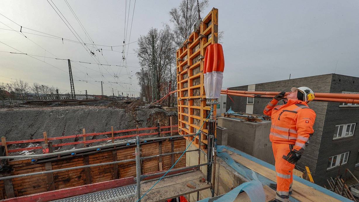 Spektakuläre Maßnahme: Bauarbeiter auf einer Brückenbaustelle am Gleiskörper nahe des Bielefelder Hauptbahnhofs. | © Andreas Zobe