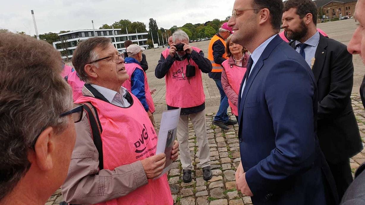 Protest in Minden: Gesundheitsminister Jens Spahn (CDU) geht im September auf die Demonstranten des Vereins der Direktversicherungsgeschädigten zu und spricht mit Bernard Kotte. | © Monika Jäger