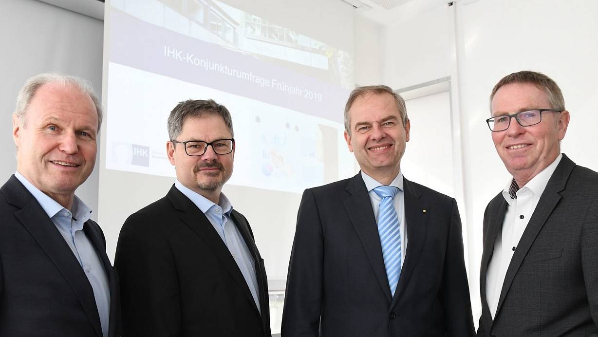 Mahnen neue Konzepte für die schrittweise Beendigung der Corona-Maßnahmen an: Thomas Niehoff (Hauptgeschäftsführer), Christoph von der Heiden (Geschäftsführer),  Wolf D. Meier-Scheuven (Präsident) und Harald Grefe (Stellvertretender Hauptgeschäftsführer) von der IHK Bielefeld. | © IHK