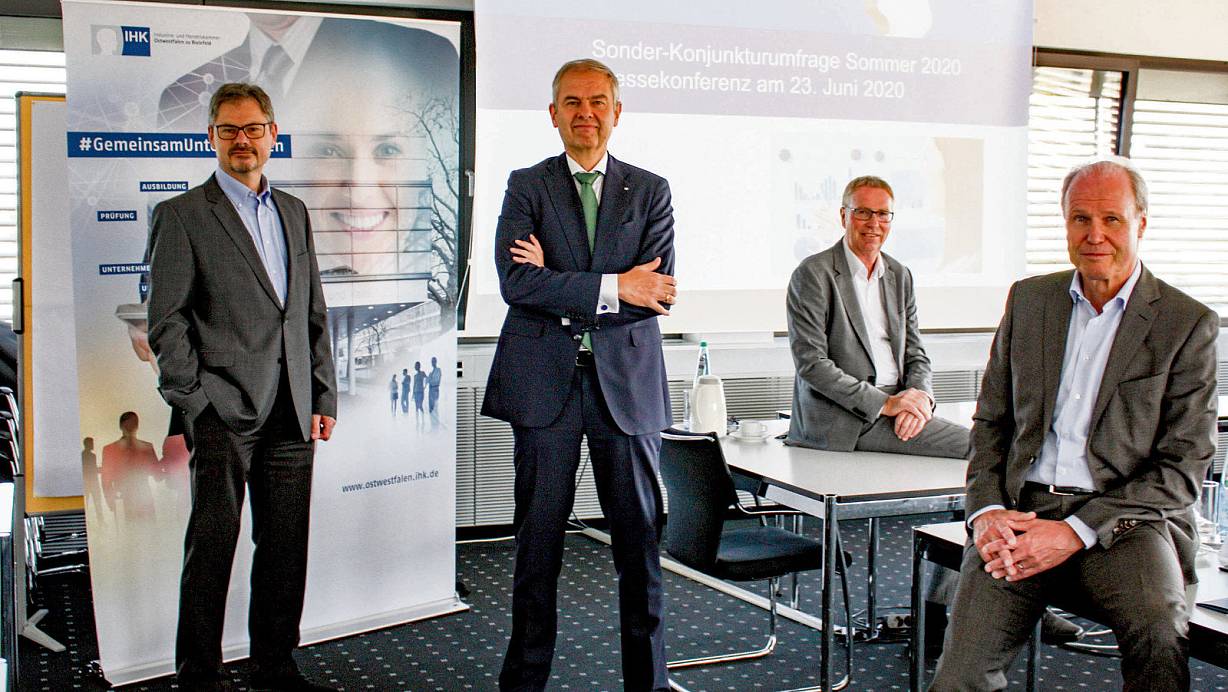 IHK-Geschäftsführer Christoph von der Heiden (v.l.), IHK-Präsident Wolf D. Meier-Scheuven, der stellvertretende IHK-Hauptgeschäftsführer Harald Grefe und IHK-Hauptgeschäftsführer Thomas Niehoff präsentierten die Ergebnisse der Sonderkonjunkturumfrage. | © Sebastian Beeg