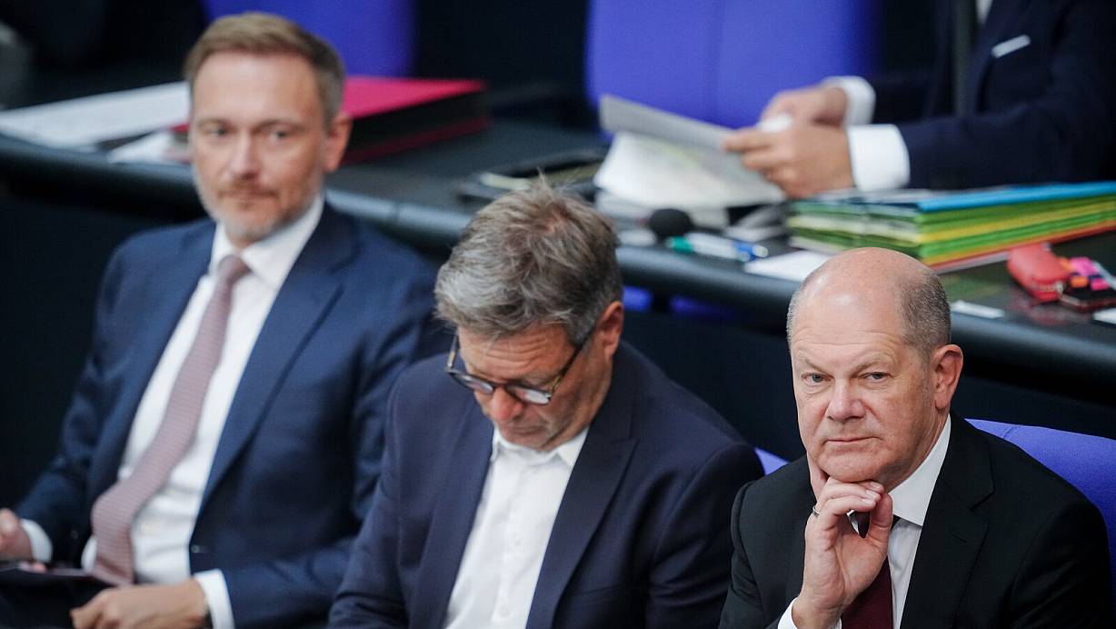 Können sich nicht einigen: Finanzminister Christian Lindner (v.l., FDP), Wirtschaftsminister Robert Habeck (Grüne) und Bundeskanzler Olaf Scholz (SPD). | © Kay Nietfeld/dpa