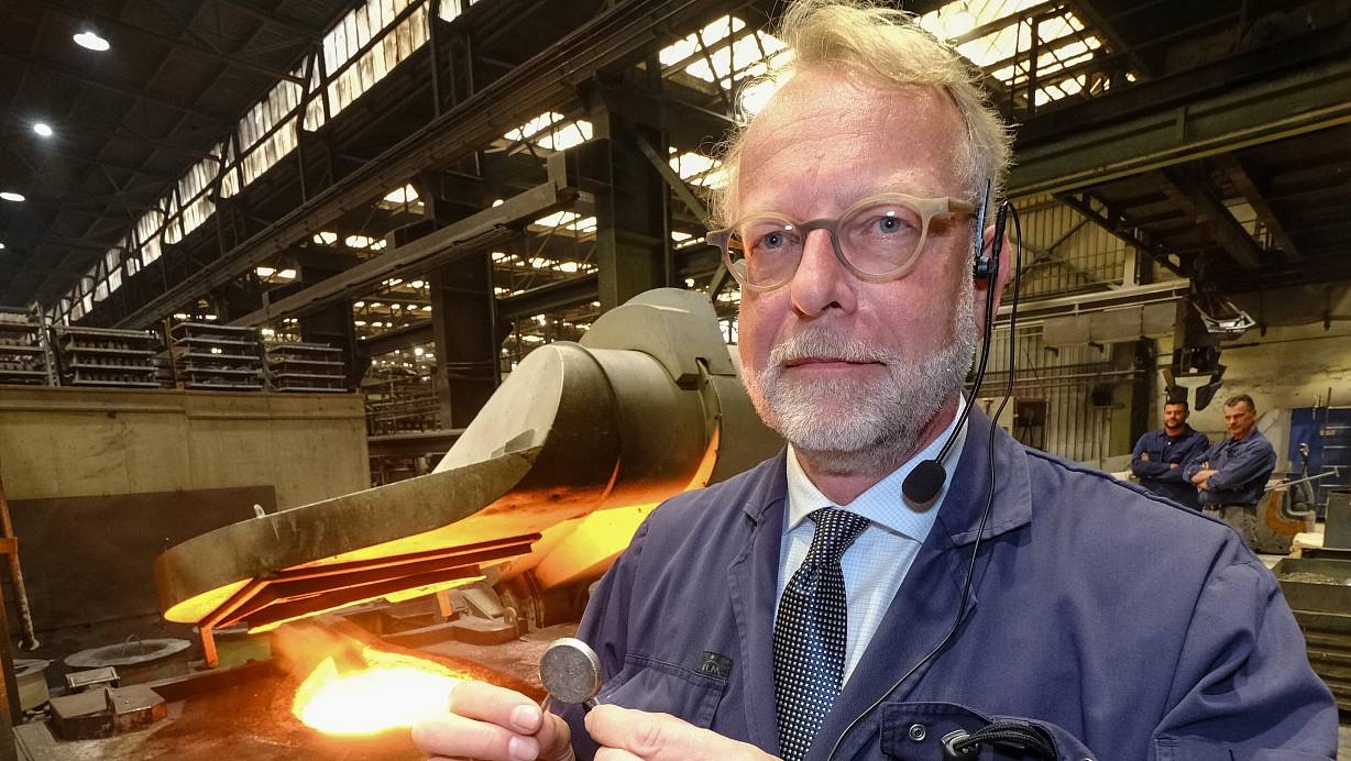 Clemens Küpper vor dem Eisenschmelzofen in der Eisengiesserei Baumgarte mit einer Spektral-Probe in der Hand. Durch sie wird ermittelt, welche chemischen Stoffe in dem Material sind, das sie schmelzen. | © Andreas Zobe