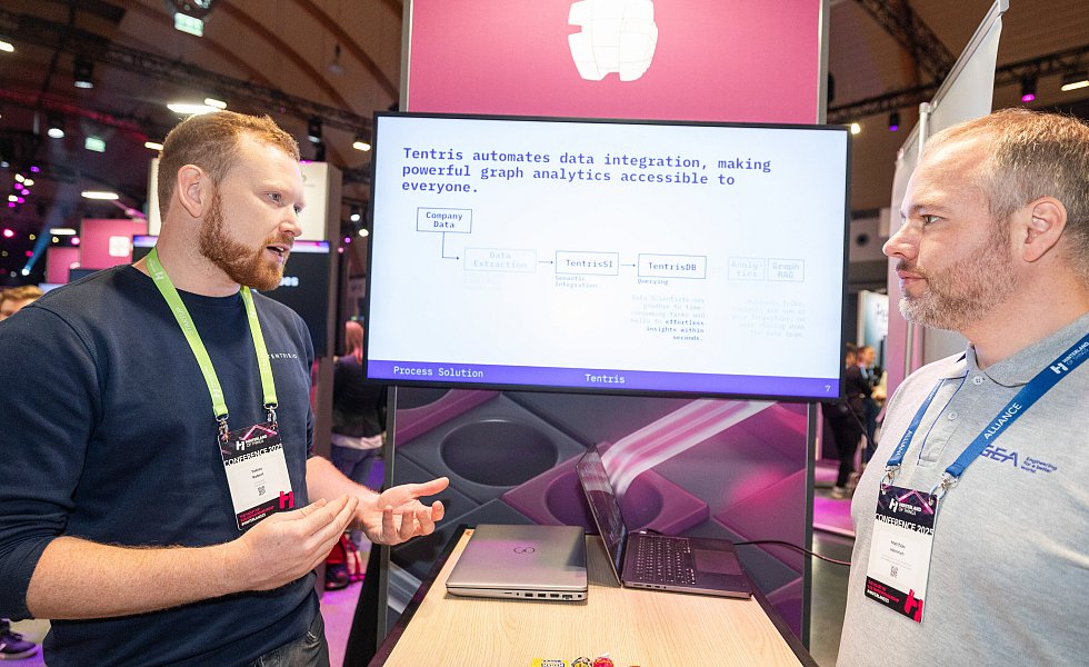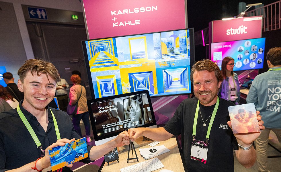 Aus Herford war der Gründer Tobias Rebert mit seinem Start-up „Tentris“ auf der Ausstellungsfläche vertreten. Seine Firma hat eine Software entwickelt, die mit sogenannter Graphentechnologie Datenberge zu einer Art Mindmap verarbeitet und so schneller und umweltschonender als herkömmliche Datenbänke arbeitet. Und deutlich weniger datenorientiert, aber dennoch KI-gestützt arbeiten die Gründer Mats Karlsson und Vito Kahle, die mit ihrem Start-up „Karlsson+Kahle“ passende Kunst zur Corporate Identity eines Unternehmens anbieten.