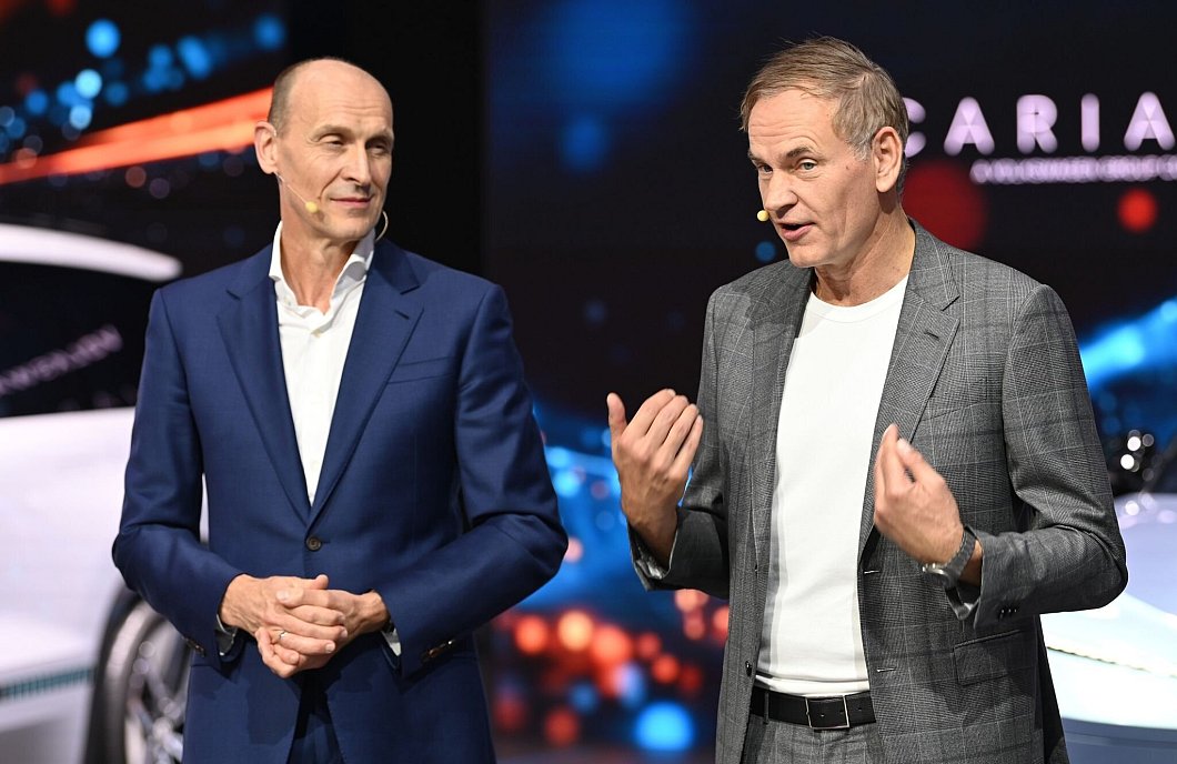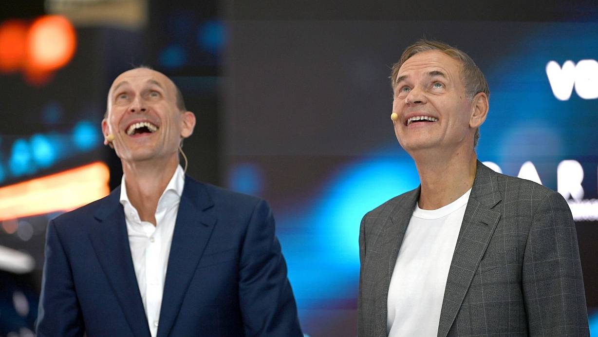 Volkswagen-Chef Oliver Blume (r) und Volkswagen-Vorstandmitglied für China, Ralf Brandstätter, in Shanghai. Der Konzern investiert trotz Schwierigkeiten viel Geld in die neue Technologie. | © Johannes Neudecker/dpa