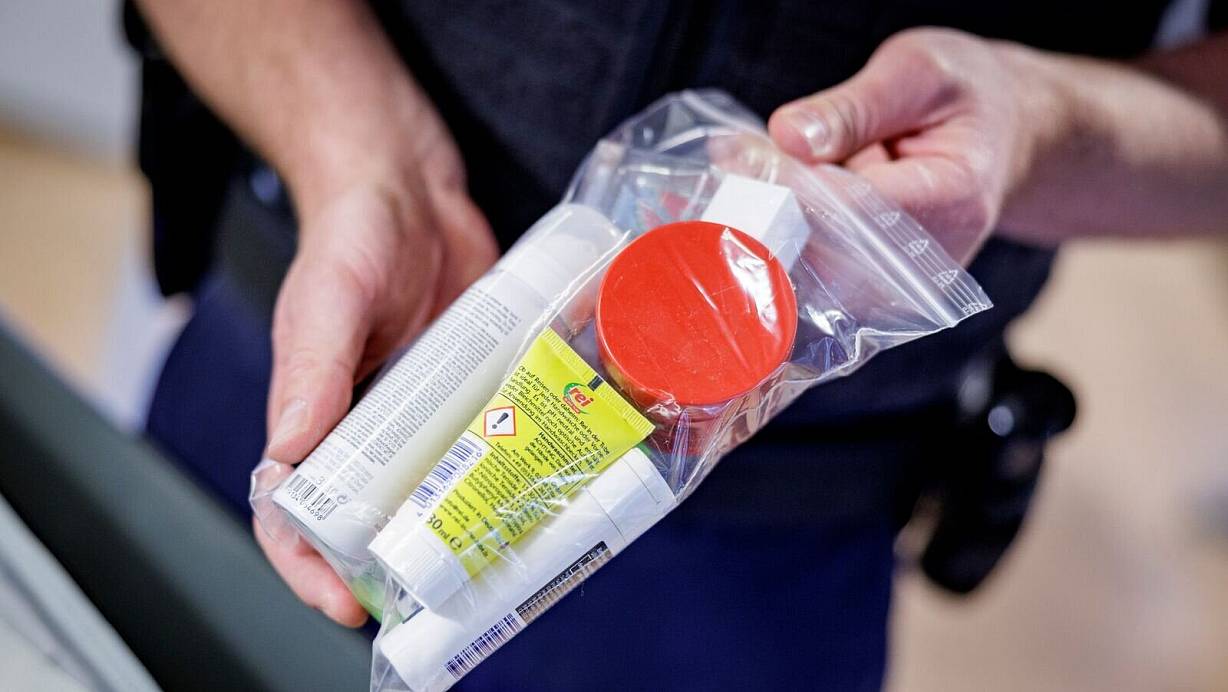 Die meisten Airlines erlauben Flüssigkeiten nur in 100-Milliliter-Containern und insgesamt nur einen Liter pro Person. Das ganze muss in einer durchsichtigen Plastiktüte verpackt und meistens separat an der Sicherheitskontrolle präsentiert werden.