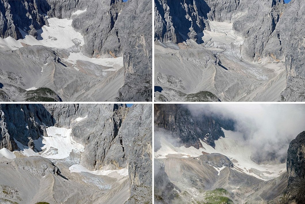 Auf den Bildern der vergangenen Jahre ist der Schwund des Gletschereises unterschiedlich gut zu erkennen – je nachdem, wie viel Schnee aus der jeweiligen Saison noch am Gletscher liegt.