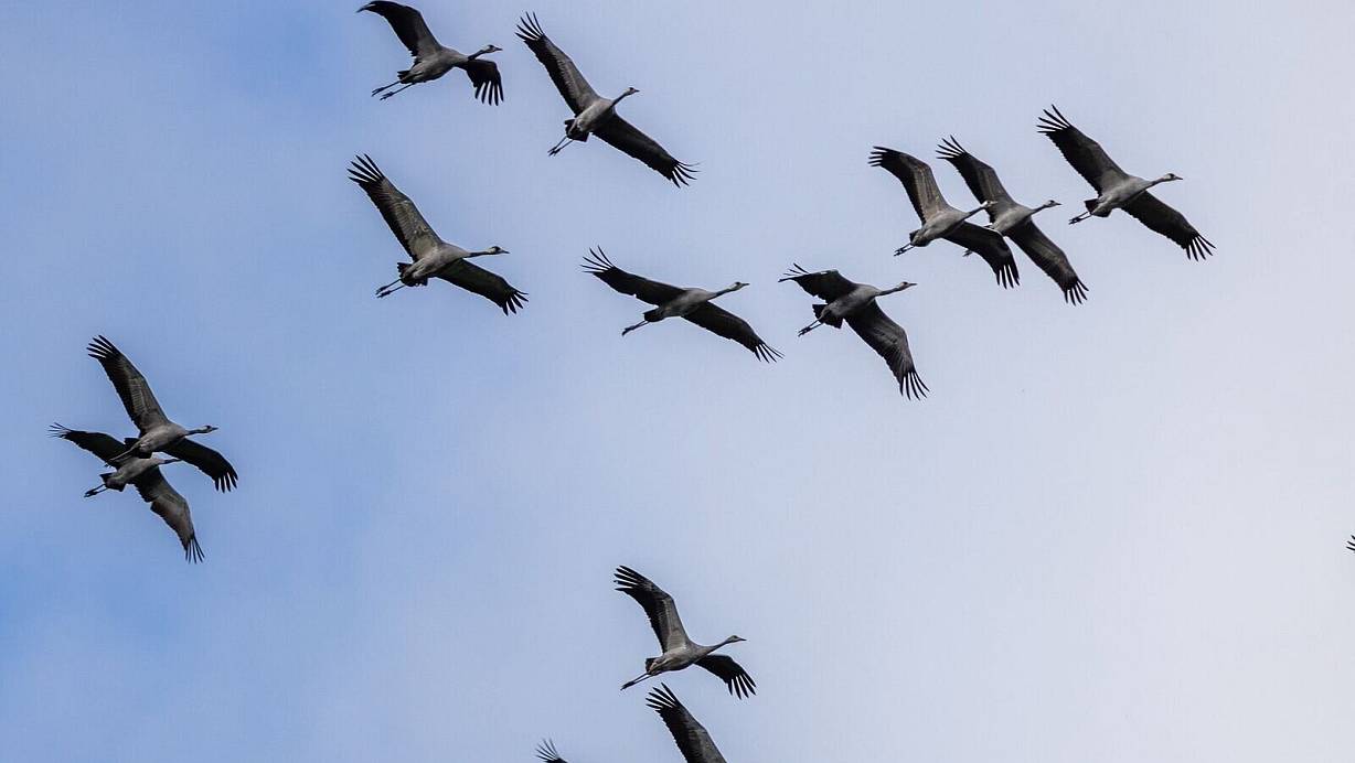 Viele Kraniche sammeln sich aber auch noch an Rastplätzen im ganzen Land. Mehr als 100.000 Kraniche befinden sich demnach derzeit in Deutschland. Im Flug bilden die mehr als einen Meter großen Vögel - Fachname Grus grus - eine V-förmige Formation mit kräftigen, erfahrenen Tieren an der Spitze.