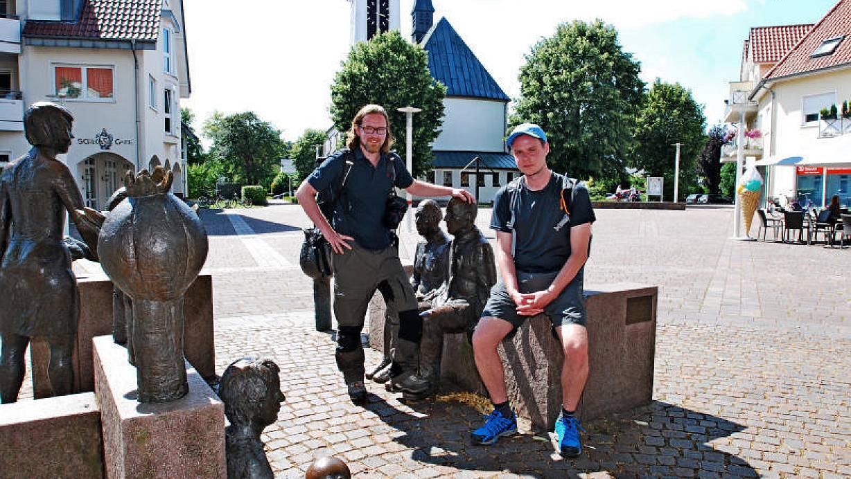 Rast auf dem Holter Kirchplatz: Tyler Larkin und Stefan Boes durchwandern Ostwestfalen-Lippe von Süden nach Norden. Gestern haben sie sich das Quellgebiet der Ems angeschaut und sind durch die Moosheide gewandert. | © Gunter Held