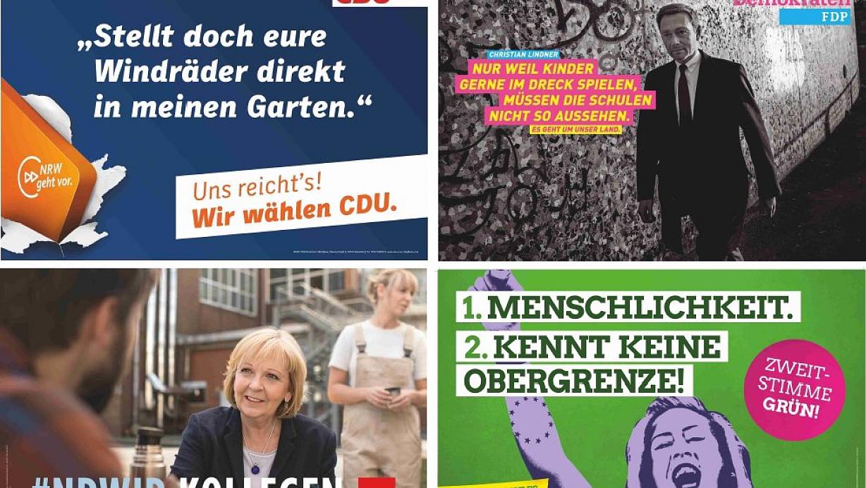Von Protest bis Stolz: Wahlplakate der CDU und der FDP, von den Grünen und ihrem Koalitionspartner in Nordrhein-Westfalen, der SPD (im Uhrzeigersinn). |