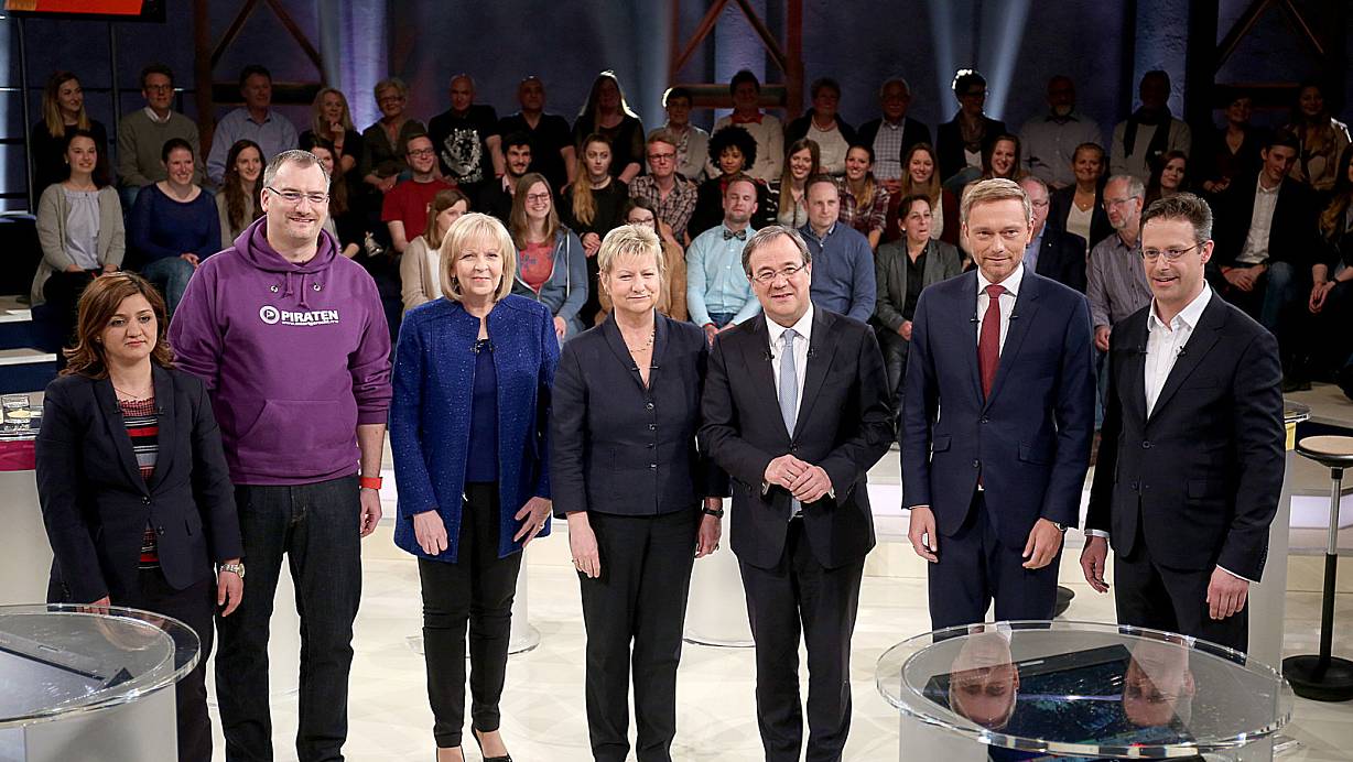 Die Spitzenkandidaten der sieben Parteien für die Landtagswahl in Nordrhein-Westfalen, Özlem Alev Demirel (v. l.), Michele Marsching (Piraten), Hannelore Kraft (SPD), Sylvia Löhrmann (Grüne), Armin Laschet (CDU), Christian Lindner (FDP) und Marcus Pretzell (AfD), stehen am 04.05.2017 in Köln (Nordrhein-Westfalen) in der TV-"Wahlarena". | © dpa