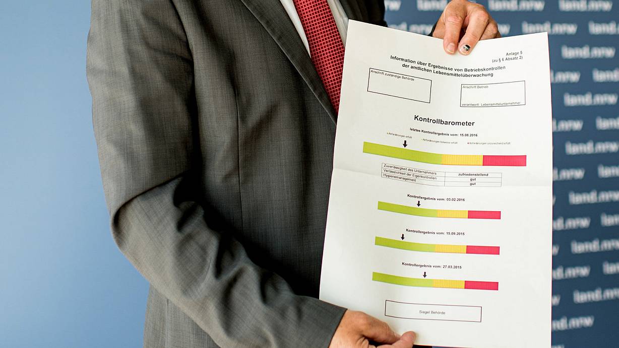 Der nordrhein-westfälische Umweltminister Johannes Remmel mit dem so genannte "Kontrollbarometer-System", besser bekannt als "Hygiene-Ampel". | © picture alliance / dpa