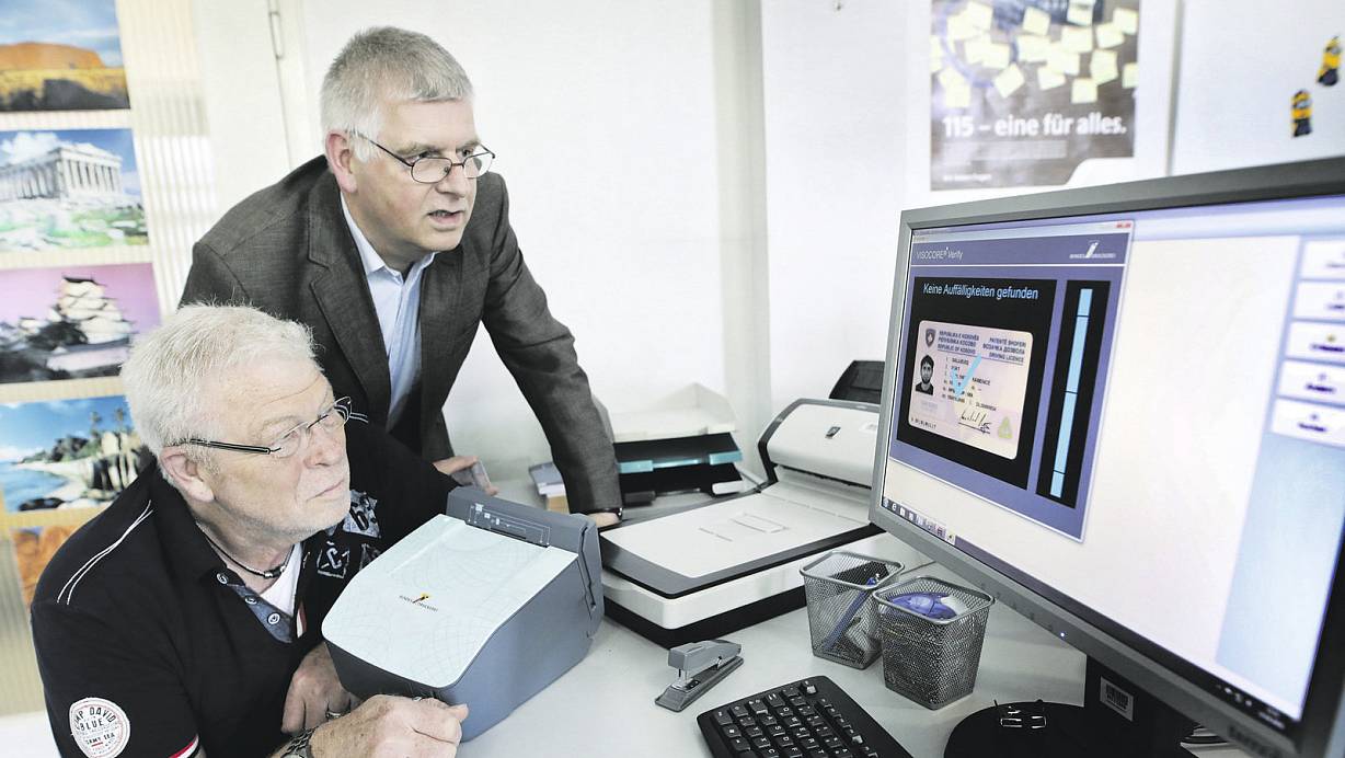 Rolf-Dieter Zawada, Leiter der Bielefelder Fahrerlaubnisbehörde, und Jens Middeldorf von der Kfz-Zulassungsstelle, finden dank der neuen Prüfsysteme in Sekunden heraus, ob ein Ausweisdokument echt ist oder nicht. | © Sarah Jonek