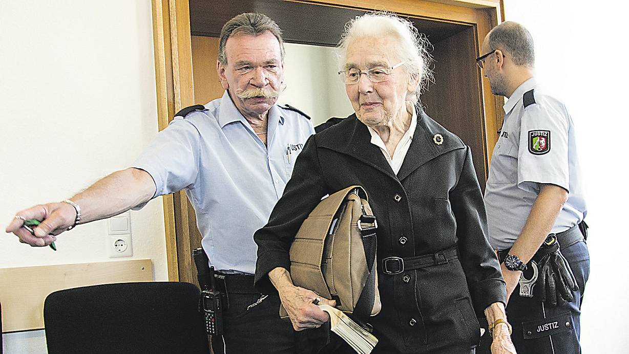 Da geht es lang: Justizhauptwachtmeister Reinhard Kleesiek weist im Amtsgericht Detmold der Holocaust-Leugnerin Ursula Haverbeck aus Vlotho den Weg. Foto: dpa | © Verwendung weltweit