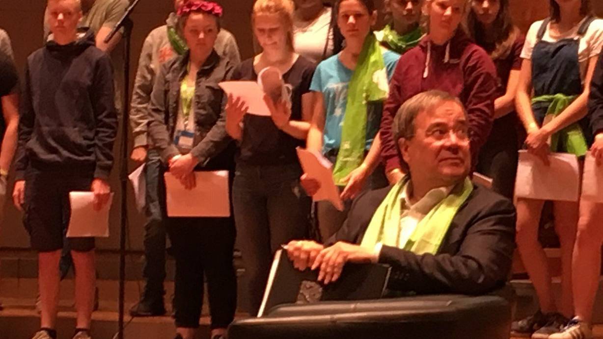 Es ist auch für den Politiker Laschet eine ungewöhnliche Veranstaltung. Ein wenig kokettiert er mit seiner katholischen Konfession: "Auch wir haben eine Bibel", gibt er verschmitzt zu Protokoll, als Kirchentagspräsidiumsmitglied Karin von Welck es als ungewöhnlich bezeichnet, dass der Katholik Laschet sich für die Bibelarbeit auf dem Evangelischen Kirchentag zur Verfügung stellt. Und das Publikum empfängt ihn, abseits jeder parteipolitischen Präferenz, wohlwollend, ja mit Sympathie.
