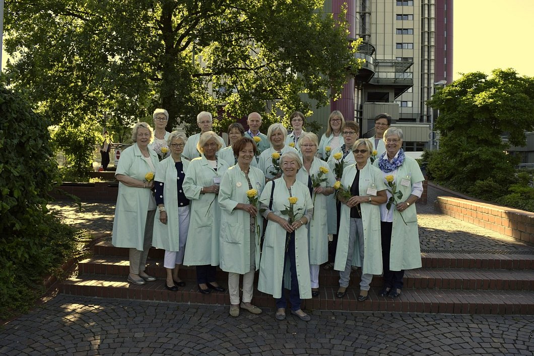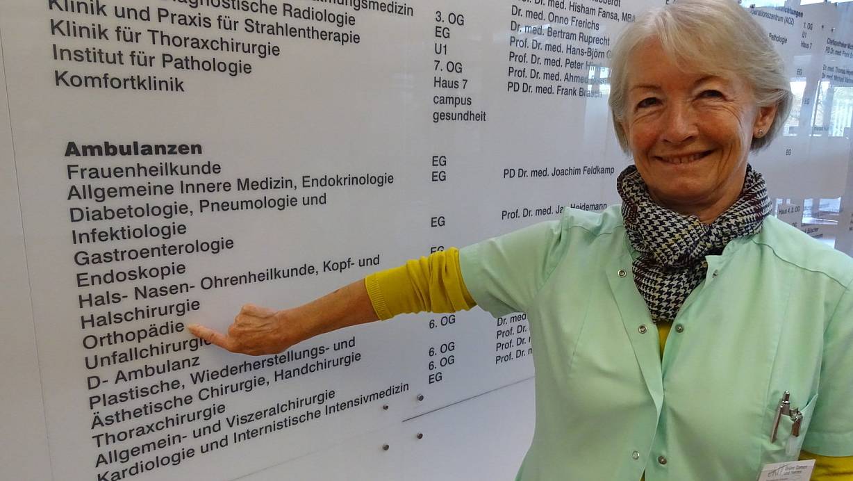 Während in Bonn der Festgottesdienst stattfindet, stehen in Bielefeld sieben Grüne Damen den Patienten im Krankenhaus in Bielefeld-Mitte mit Rat, Tat und einem offenen Ohr zur Seite, gut zu erkennen an ihren lindgrünen Kitteln. Lütger erklärt den im Foyer gestrandeten Gästen den Weg, der Mann im Rollstuhl soll zur Unfall-Chirurgie. „Den Gang hier geradeaus weitergehen", sagt sie. „Hinter den Fahrstühlen rechts abbiegen und dann die erste Tür links." Die Richtungsangaben verdeutlicht sie mit Handzeichen. Der Mann lächelt erleichtert, nickt kurz. Er schnappt sich die Griffe des Rollstuhls und schon sind die drei auf dem richtigen Weg.