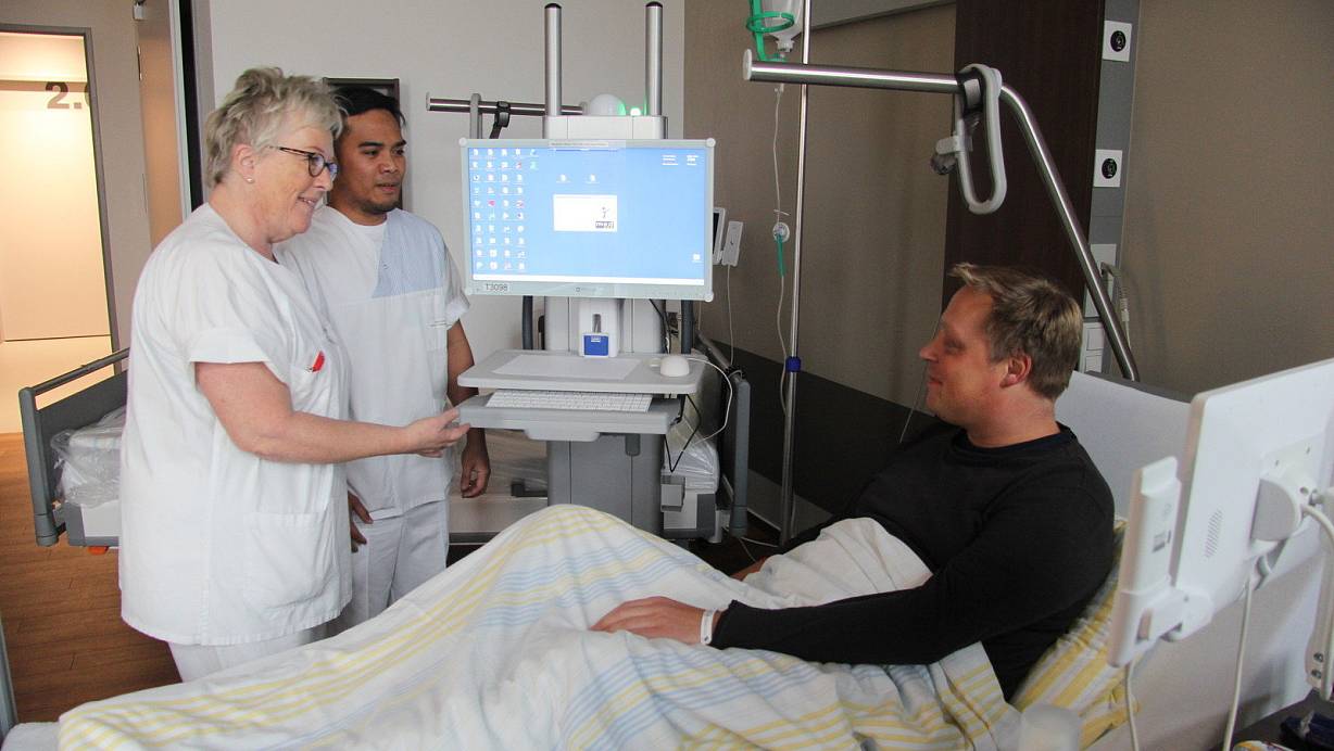 Heidi Kage unterstützt ihren neuen Kollegen Noemar Gelvoligaya bei einem Gespräch mit Patient Richard Schroeder. | © Carolin Nieder-Entgelmeier