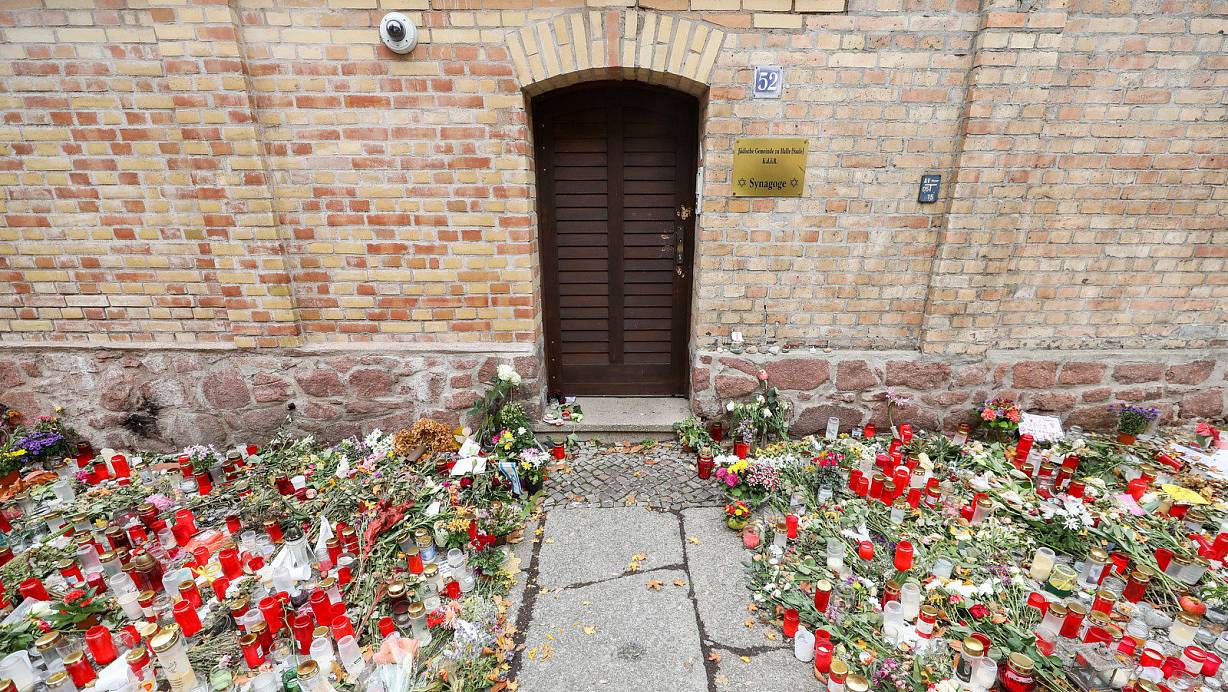Nur noch ein schmaler Weg führt zwischen den Blumen und Kerzen zur Tür der Synagoge Halle. Am 9. Oktober hatte der Deutsche Stephan B. schwer bewaffnet erst versucht, in eine Synagoge einzudringen. | © picture alliance/Jan Woitas/dpa-Zentralbild/dpa