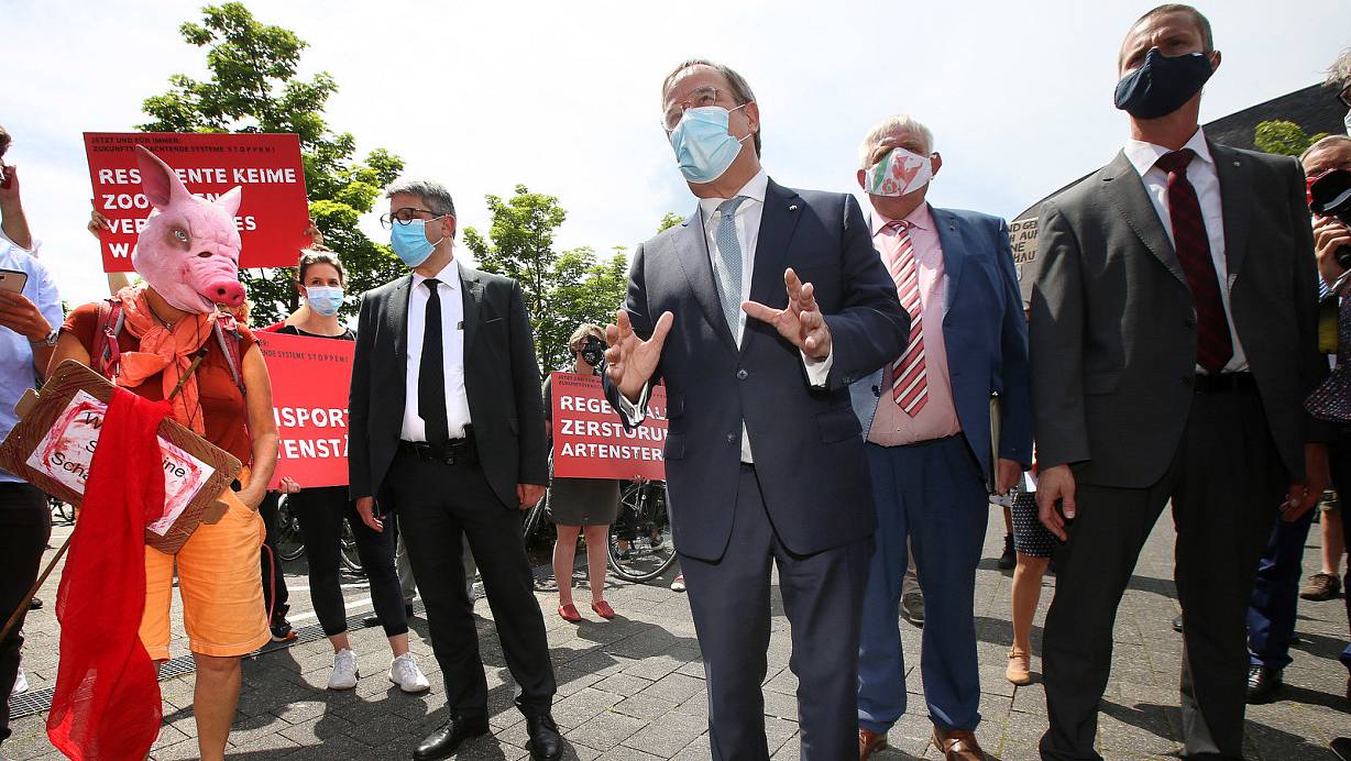 Deutliche Haltung: Armin Laschet, Karl-Josef Laumann und Sven-Georg Adenauer mit Demonstranten vor dem Kreishaus in Gütersloh. | © Patrick Menzel