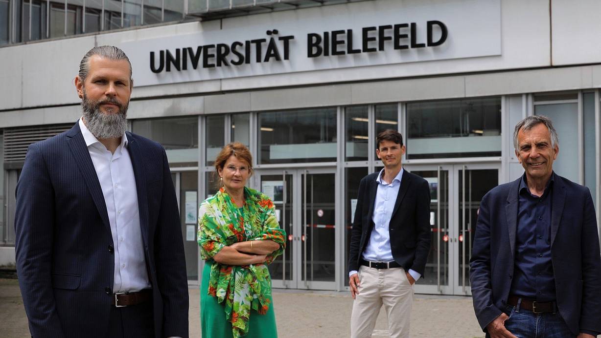 Björn Spittau, neuer Professor für Anatomie, wird begrüßt von Gründungsdekanin Claudia Hornberg, Fakultätsgeschäftsführer  Frank Lohkamp und Gerhard Sagerer, Rektor der Universität Bielefeld (v. l.). | © Universität Bielefeld/S. Sättele