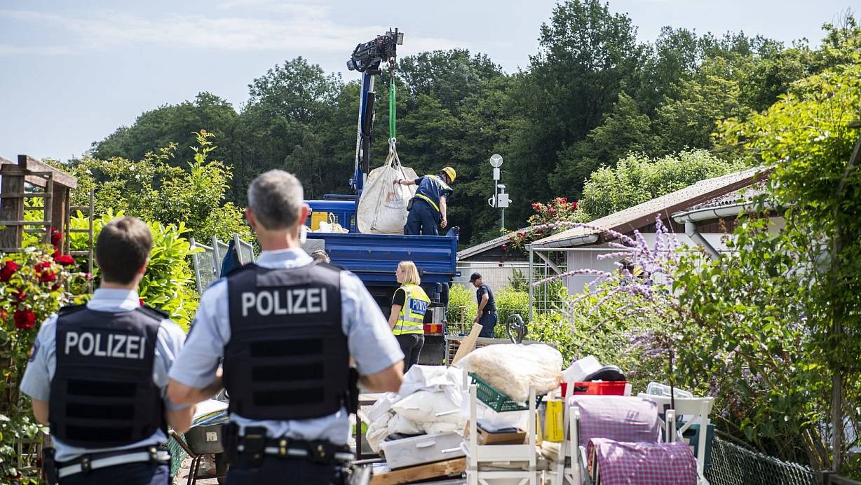 Polizisten im Juni vor der Gartenlaube in Münster, in der mehrere Kinder missbraucht worden sein sollen. | © picture alliance / Kirchner-Medi
