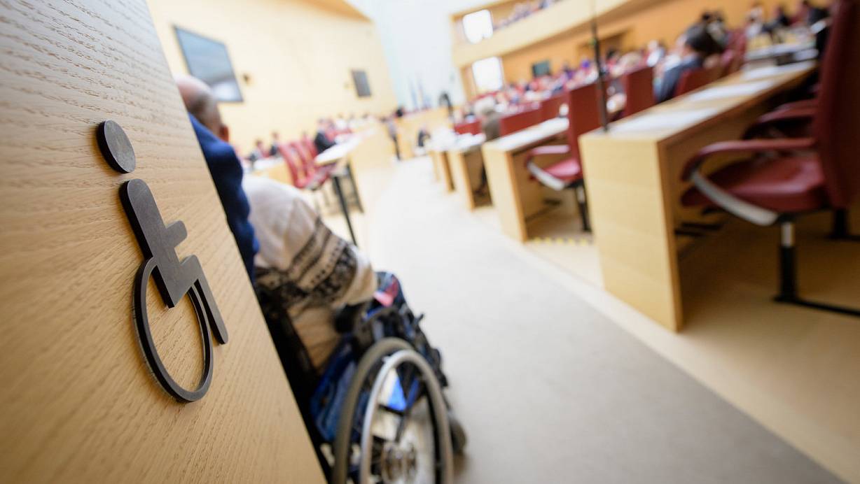 Ein Rollstuhlfahrer besucht eine Sitzung im Plenarsaal. | © picture alliance / Matthias Balk/dpa