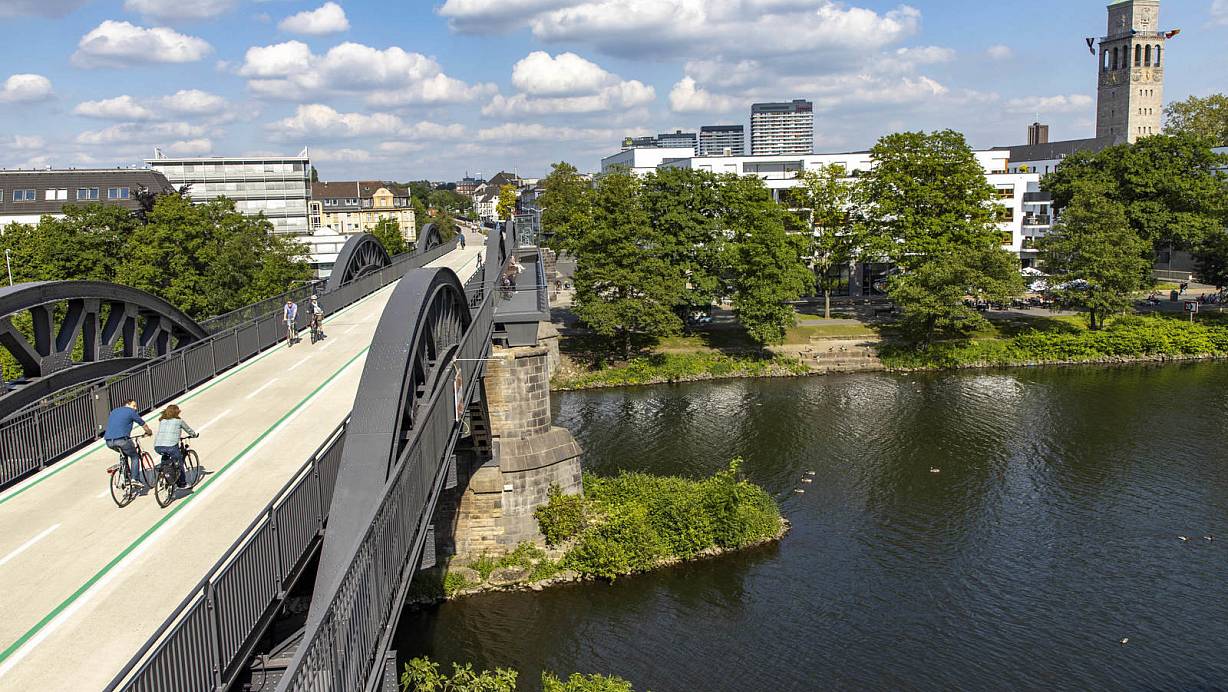 In Mülheim an der Ruhr führt der Radschnellweg "RS1" über eine ehemalige Eisenbahnbrücke. | © picture alliance/dpa