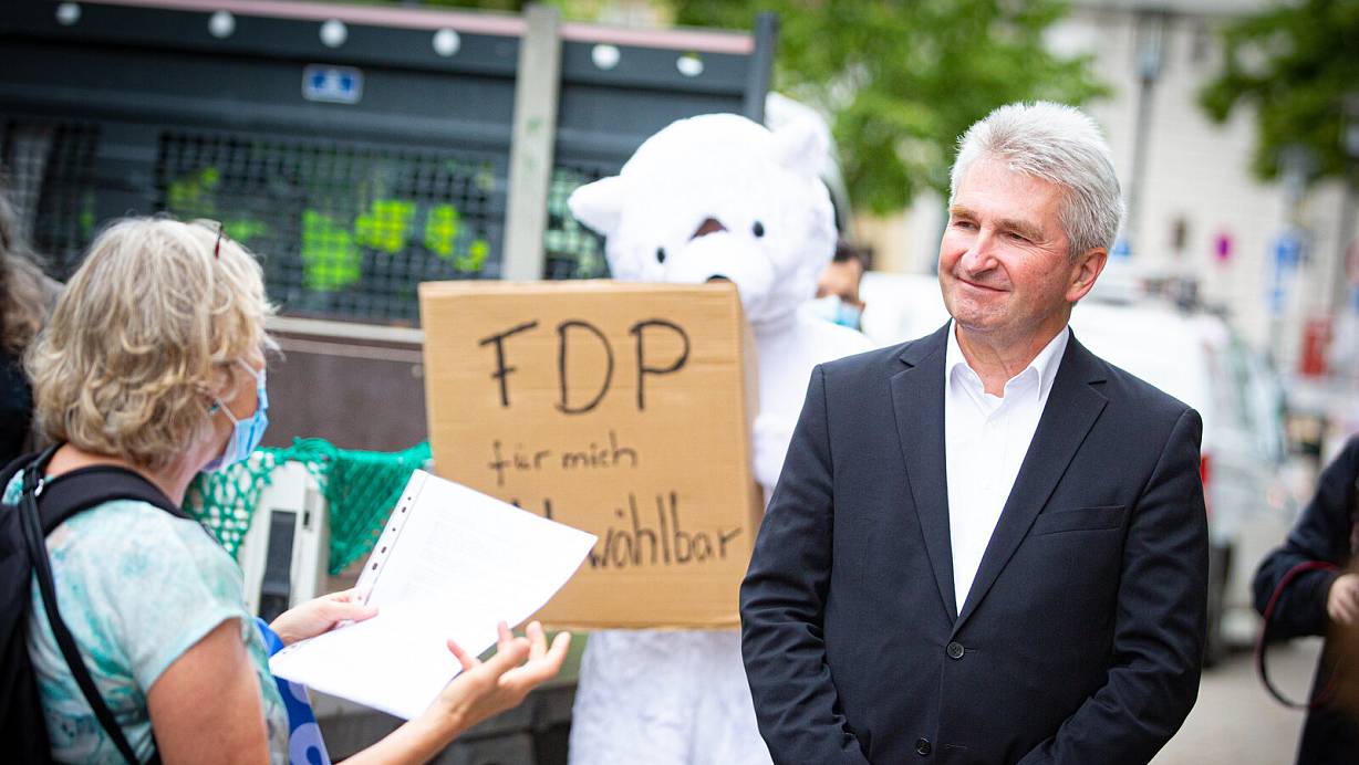 Angelika Claußen vom Klimabündnis Bielefeld (l.) im Gespräch mit NRW-Wirtschaftsminister Andreas Pinkwart in Bielefeld. | © NW