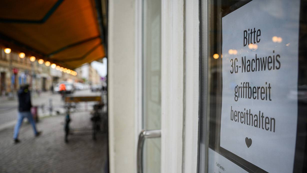 "Bitte 3G-Nachweis griffbereit bereithalten" steht auf einem Zettel an einer Bar. | © picture alliance/dpa/dpa-Zentralbild