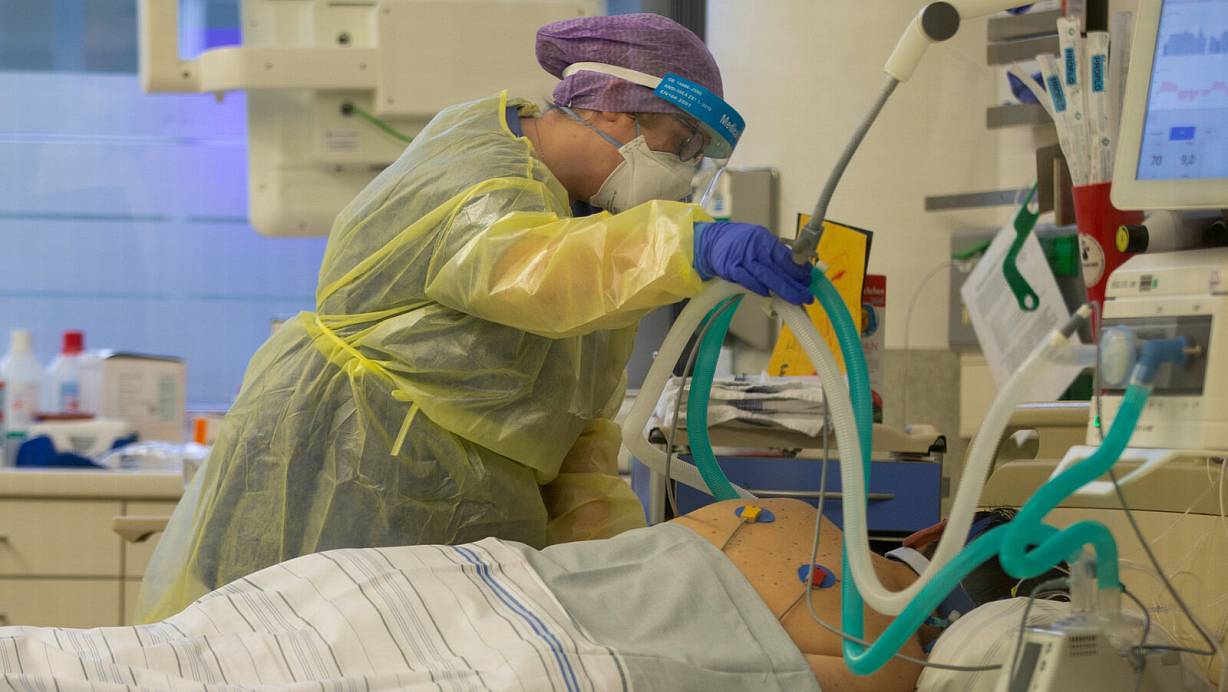 Eine Krankenschwester betreut einen Covidpatienten auf der Intensivstation, der künstlich beatmet werden muss. | © picture alliance/dpa