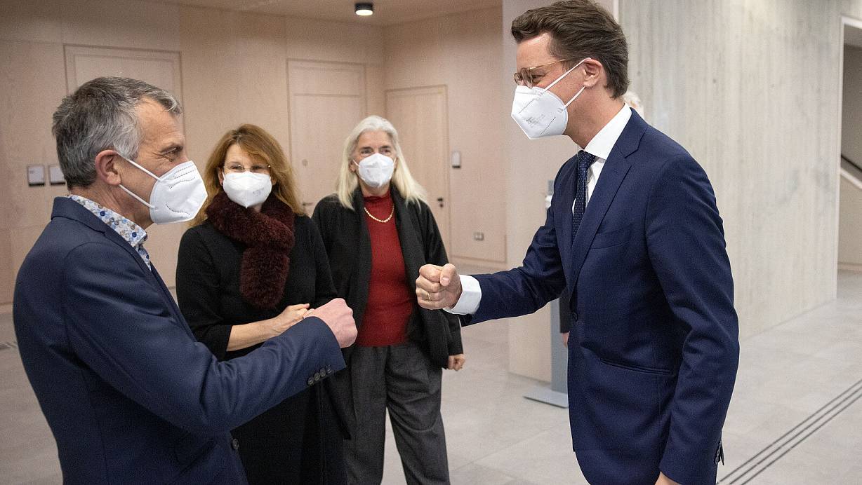 NRW-Ministerpräsident Hendrik Wüst begrüßt den Rektor der Universität Bielefeld, Gerhard Sagerer. | © Oliver Krato