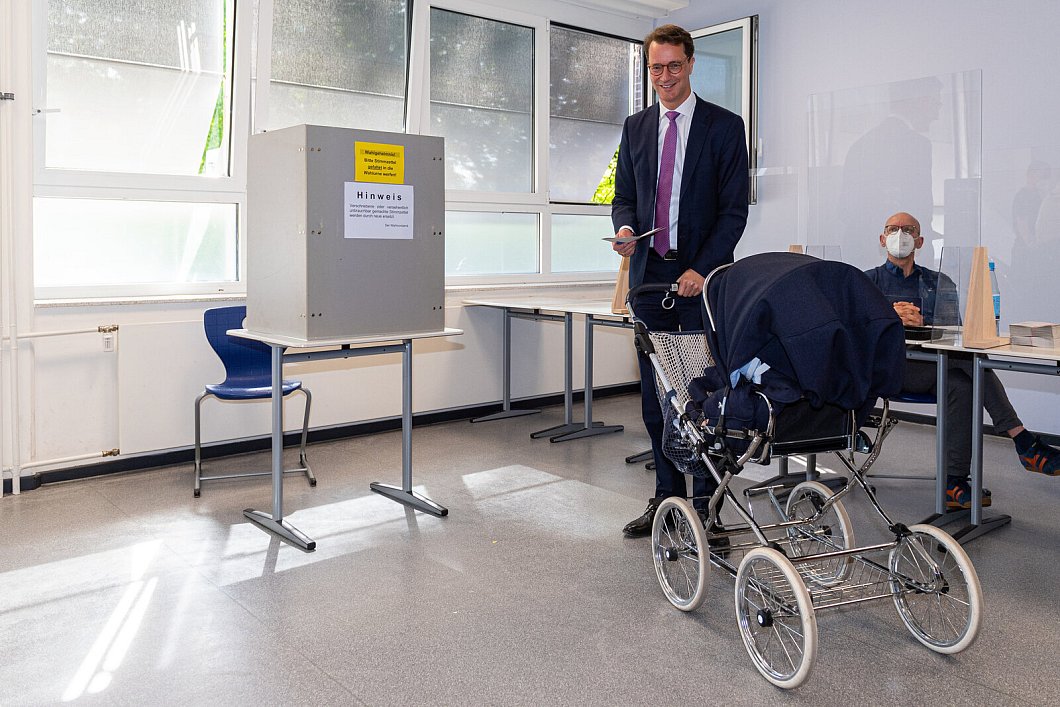 Sonntagmorgen in seiner Heimatstadt Rhede seine Stimme für die Landtagswahl in Nordrhein-Westfalen abgegeben. Der 46 Jahre alte Jurist kam mit seiner Frau Katharina zum Wahllokal und schob das einjährige Töchterchen Philippa wie schon bei seiner Amtseinführung vor einigen Monaten im blauen Kinderwagen vor sich her. "Uns geht es prima. Es ist ein wunderbarer Tag in Nordrhein-Westfalen, wunderbares Wetter. Es ist einen toller Tag, um wählen zu gehen", sagte Wüst