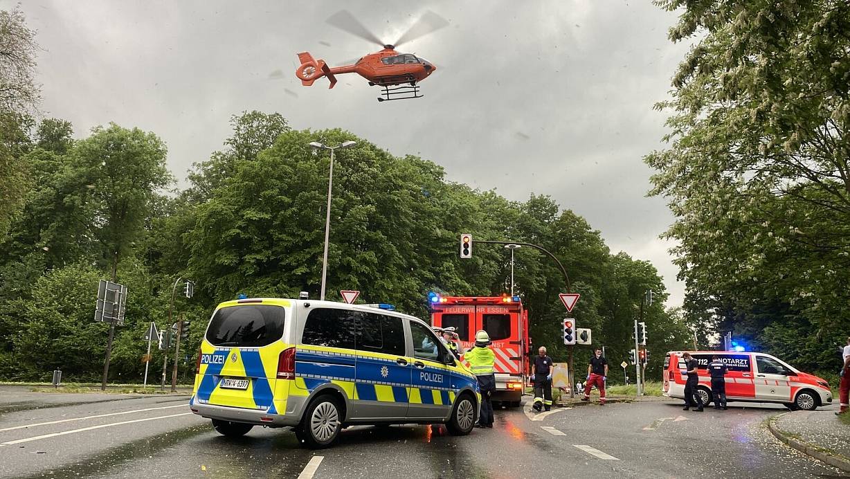 Bei den heftigen Unwettern ist am Montagnachmittag in Essen ein 56-jähriger Mann vom Blitz getroffen und lebensgefährlich verletzt worden. Er musste noch am Unglücksort vom Rettungsdienst wiederbelebt werden, wie die Feuerwehr der Ruhrgebietsstadt mitteilte. Danach wurde der 56-Jährige mit einem Rettungshubschrauber in eine Spezialklinik geflogen.