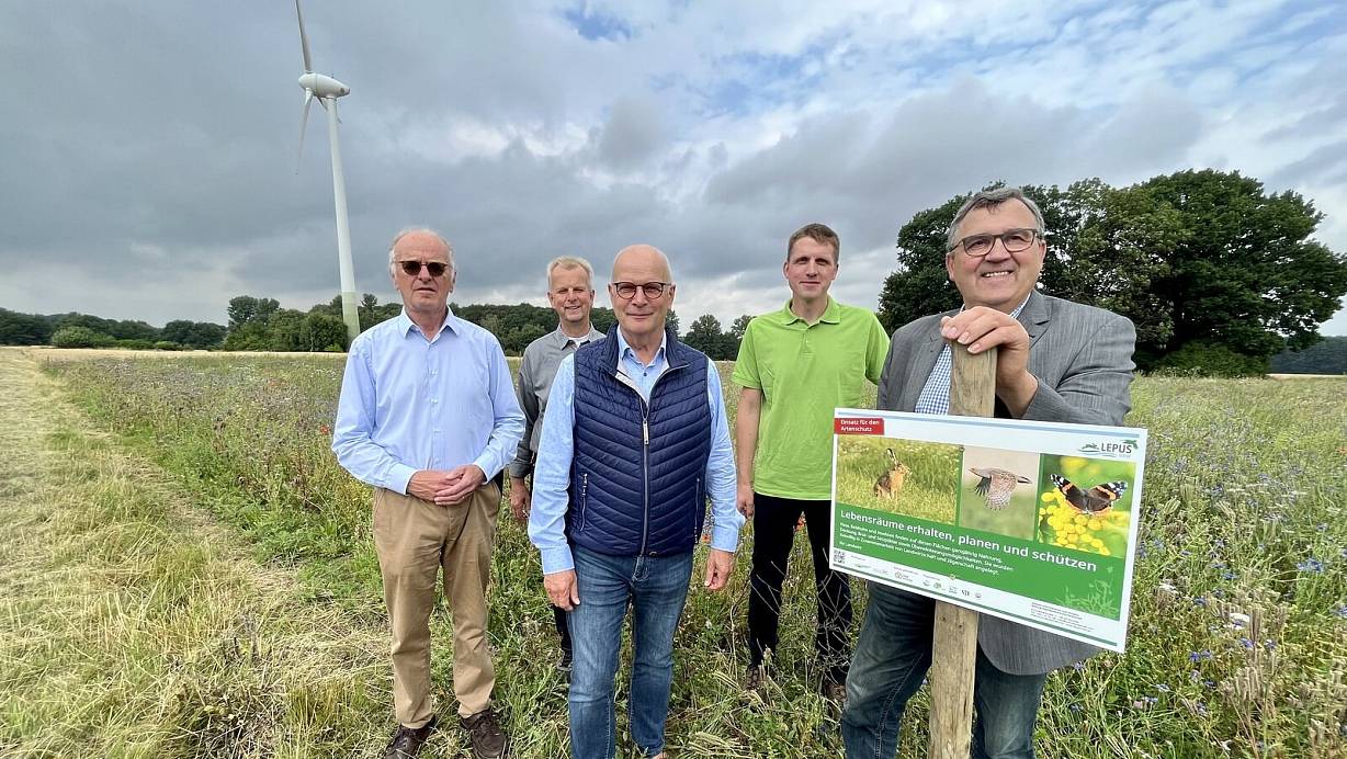 Friedrich-Wilhelm König (v. l.), Hermann Dedert, Hubertus Beringmeier, Sven Nadolny und Antonius Tillmann stellen das Lepus-Projekt auf dem Ringsthof der Familie König in Enger vor. | © Mareike Köstermeyer