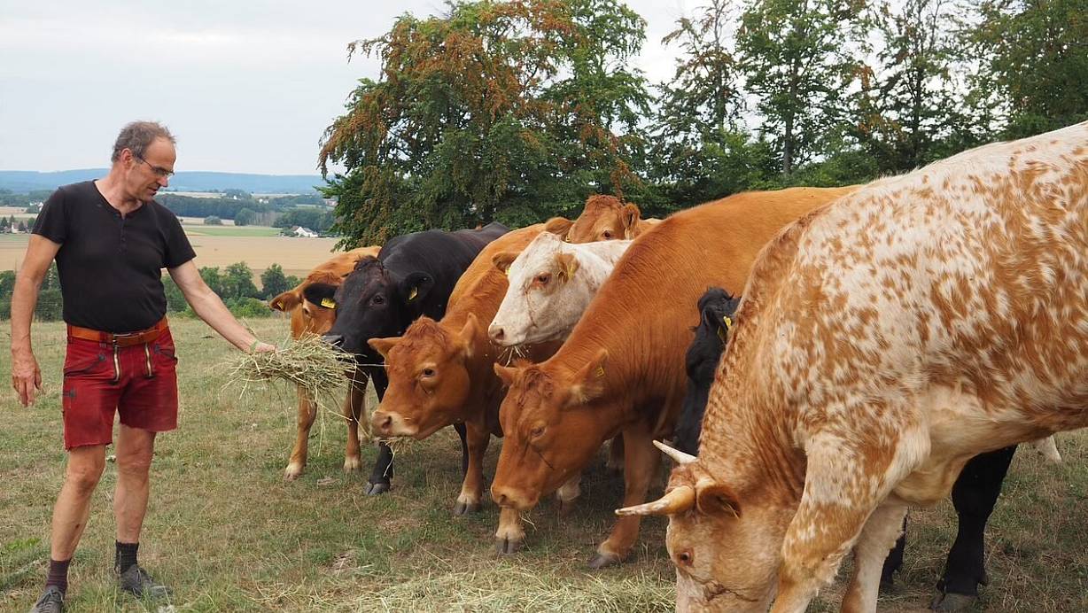 Ulf Allhoff-Cramer füttert seine Kühe auf einer kargen Weide mit Gras. Bereits jetzt muss er sein eigentlich für den Wintger gedachtes Futter angreifen. | © Johanna Salentin