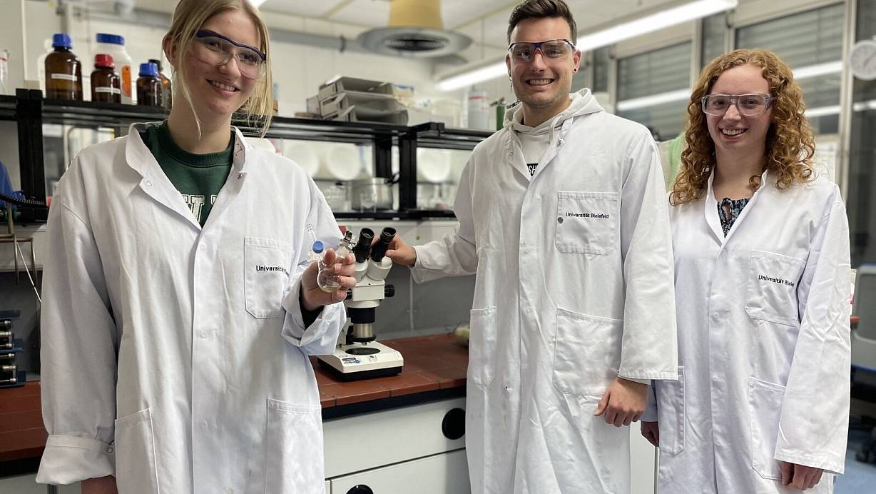 Kerstin Elsinghorst (v.l.), Nicolai Diethold und Julia Weimann stehen in einem Chemie-Forschungslabor der Uni Bielefeld. | © Janina Pietruschka