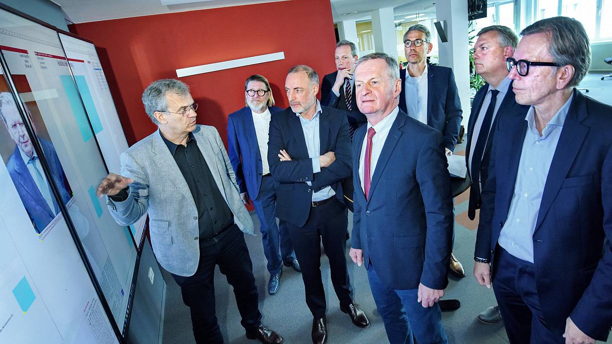 Chefredakteur Thomas Seim (v. l.) und sein Stellvertreter Carsten Heil mit den Klinikchefs Mathias Kreft, Johannes Hütte, Georg Rüter, Matthias Ernst, Christian Jostes und Olaf Bornemeier im Newsroom. Michael Ackermann wurde per Videokonferenz zugeschaltet. | © Barbara Franke