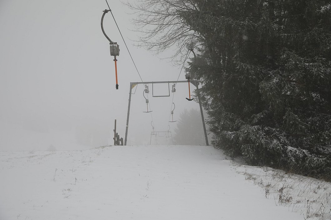 Winterberg (dpa). Schnee, so weit das Auge reicht - und noch menschenleere Skipisten: Das Wintersportgebiet rund um Winterberg im Hochsauerland hat sich am Wochenende in weißer Pracht gezeigt. Die Temperaturen lagen am Samstag tagsüber nur knapp oberhalb des Gefrierpunkts, der Schnee taute also nicht gleich wieder weg. Das Skigebiet war noch nicht in Betrieb, die Lifte waren aus.