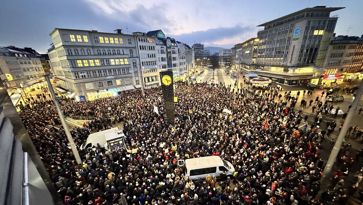 Etliche Menschen sind bereits auf dem Bielefelder Jahnplatz zusammengekommen, um gegen Rechtsextremismus zu demonstrieren. | © Mike-Dennis Müller