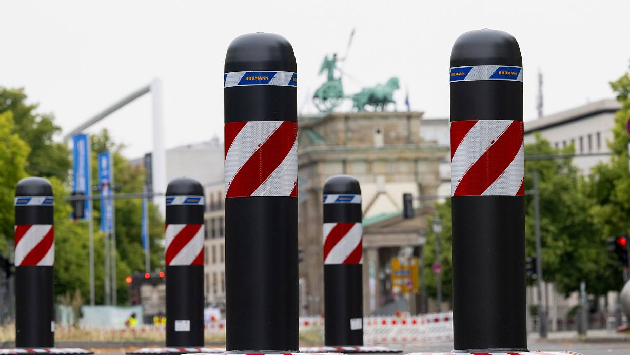 Mobile Poller mit rot-weißer Markierung sind als Absperrung zur Fanzone am Brandenburger Tor aufgestellt. | © (c) Copyright 2024, dpa (www.dpa.de). Alle Rechte vorbehalten
