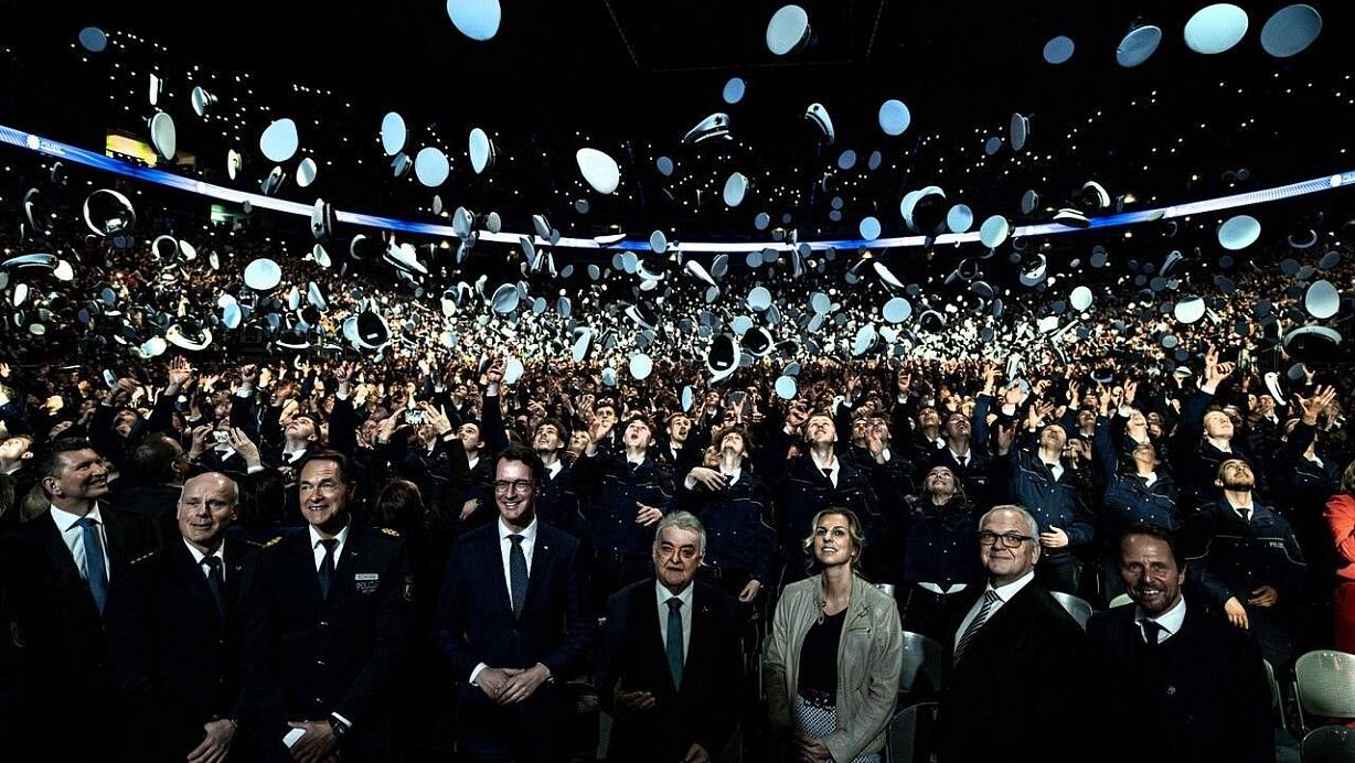 In NRW wurden im Frühjahr 3.000 Kommissaranwärter feierlich vereidigt. Mittendrin: Ministerpräsident Wüst und Innenminister Reul. | © IM NRW (2024)