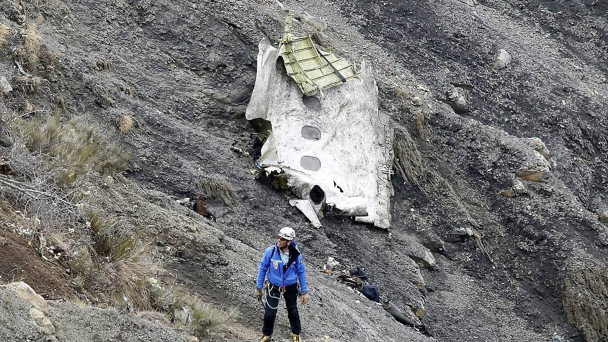 Ein Helfer steht in den französischen Alpen vor einem Wrackteil des abgestürzten Germanwings-Airbus – eine tragische Erinnerung an das Unglück vor zehn Jahren. | © dpa