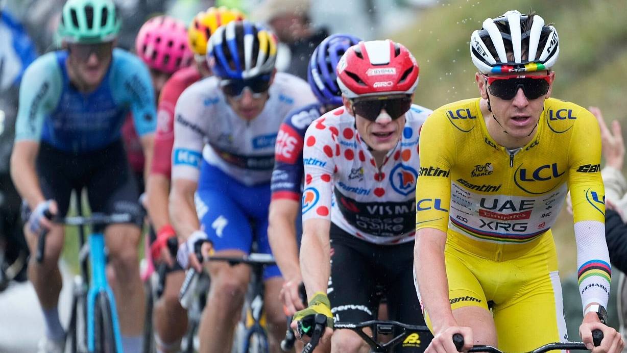 Die Top-Stars der Tour de France: Tadej Pogacar (v. r.), Jonas Vingegaard und Florian Lipowitz. Fans und Veranstalter hoffen sie auch bei der Deutschland-Tour zu sehen. | © Mosa'ab Elshamy/AP/dpa