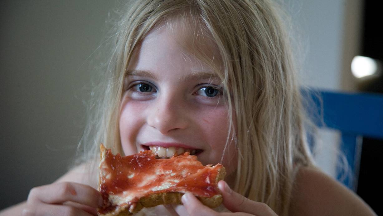 Ein Mädchen isst einen Marmeladentoast. | © picture alliance / Caro