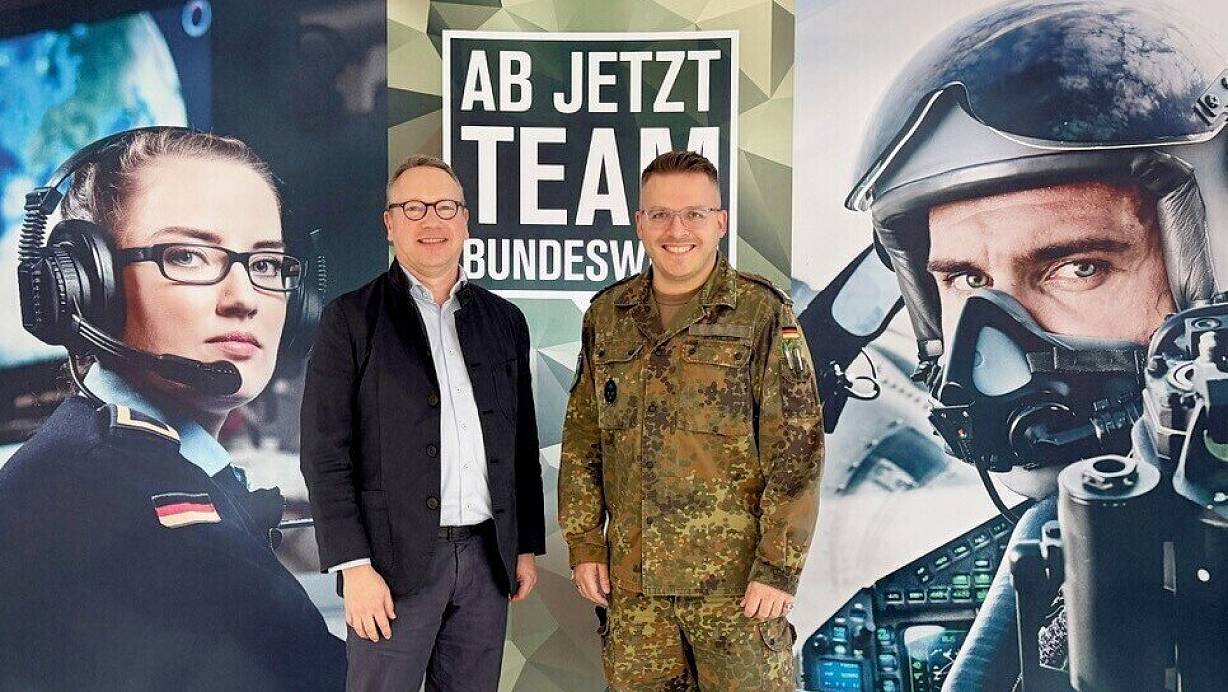 Justizminister Benjamin Limbach (Grüne, l.) mit Oberstleutnant Marcel D., Vizechef des Karrierecenters der Bundeswehr in Düsseldorf. | © Justizministerium NRW/dpa