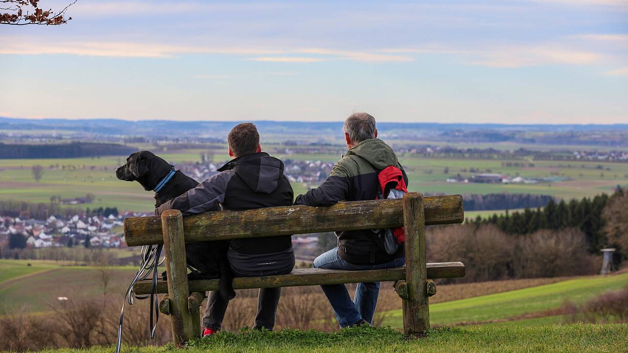 Wanderer sitzen mit einem Hund auf einer Bank am Waldrand. In den Wäldern in OWL müssen immer wieder Bänke abgebaut werden. | © picture alliance/dpa