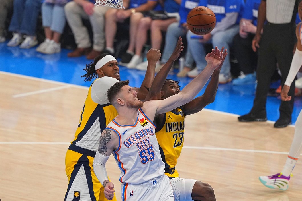 Die Oklahoma City Thunder haben zum dritten Mal gegen die Indiana Pacers gewonnen und sind in den NBA-Finals nur noch einen Sieg vom Titel entfernt. Das Team um Isaiah Hartenstein holte zu Hause ein 120:109 und führt nach Siegen nun 3:2. Hartenstein hat damit beste Chancen, als erst zweiter Deutscher nach Dirk Nowitzki die Meisterschaft in der NBA zu gewinnen. Der Würzburger hatte 2011 mit den Dallas Mavericks den Titel geholt.