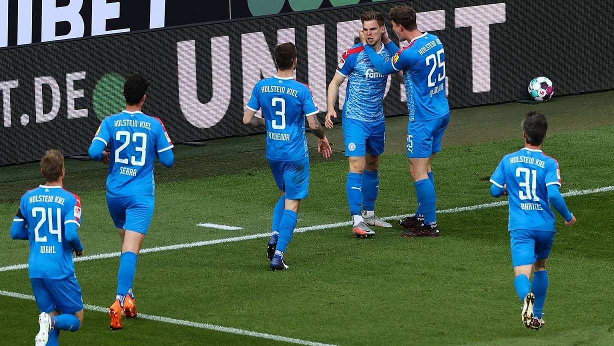 Holstein Kiel hat nach dem ersten Relegationsspiel in Köln die Tür zur Bundesliga weit aufgestoßen. | © Foto: Rolf Vennenbernd/dpa Pool/dpa