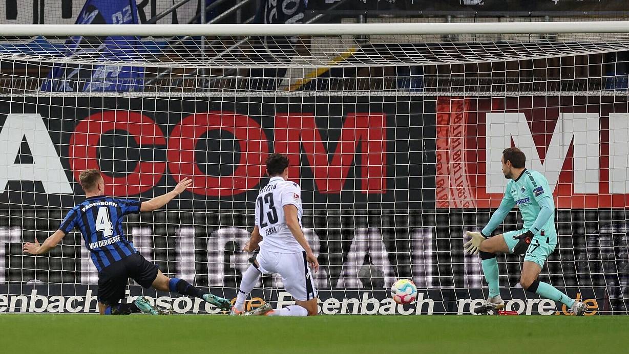 Paderborns Torwart Huth wurde für ein Handspiel außerhalb des Strafraums mit der Roten Karte bestraft. In Unterzahl agierten die Hausherren deutlich verunsichert. Die abstiegsbedrohten Bielefelder waren die aktivere Mannschaft, erarbeiteten sich einige Torchancen und nutzten schon vor der Pause die Fehler in der SC-Defensive zur 2:0-Führung, die der eingewechselte Paderborner Schlussmann Leopold Zingerle nicht verhindern konnte.