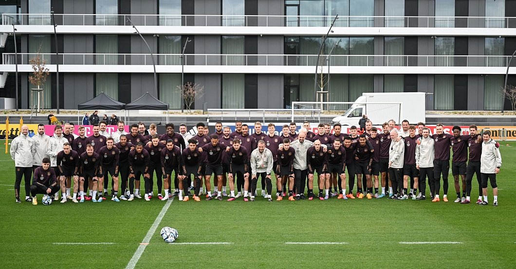 Nur das Aufwärmprogramm war einsehbar für die Medien. Zu Beginn der Übungseinheit am Mittwochvormittag stellten sich die 23 Nationalspieler um Kapitän Joshua Kimmich gemeinsam mit der ebenfalls in Frankfurt trainierenden U21-Auswahl zu einem gemeinsamen Gruppenbild auf. Am Dienstag hatte es einen Teamabend beider DFB-Formationen im Hotel der A-Mannschaft gegeben. «Die Verzahnung ist wichtig», hatte Flick betont. Er hat gleich fünf frühere oder aktuelle U21-Nationalspieler erstmals in seinen Kader für die anstehenden Länderspiele gegen Peru und Belgien berufen.